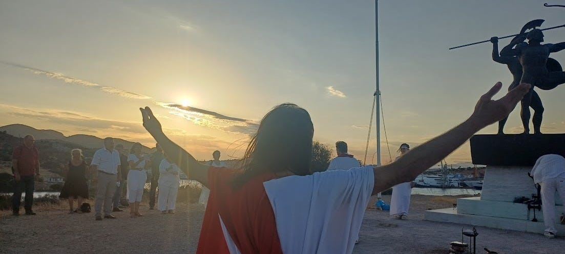 האמת היא שהגעתי לטקס די בטעות. כבר כשנה, אני חוקר את קהילות המאמינים באלי יוון הקדומים, מזאוס ועד אפרודיטה. יצא לי לבקר בכמה טקסים יפהפיים של שתי קבוצות מאמיני פוליתאיסטיות, ורציתי לפקוד את הטקסים שמארגנת "לאבריס", קהילה’ שמתיימרת על פי האתר, "להשיב את הדת היוונית הישנה ואת אורח החיים הקדום למען התחיה הקדושה”. וסיליס, המזכיר הידידותי של "לאבריס", לפרנסתו, איש שירות בתחום התוכנה, הזמין אותי לאירוע באי סלמינה, שבימים היפים נקרא סלמיס. רק באמצע הדרך, הוא הסביר לי שזהו היום בשנה שבו הם מציינים את הניצחון בקרב הנודע וסופדים לנופלים.