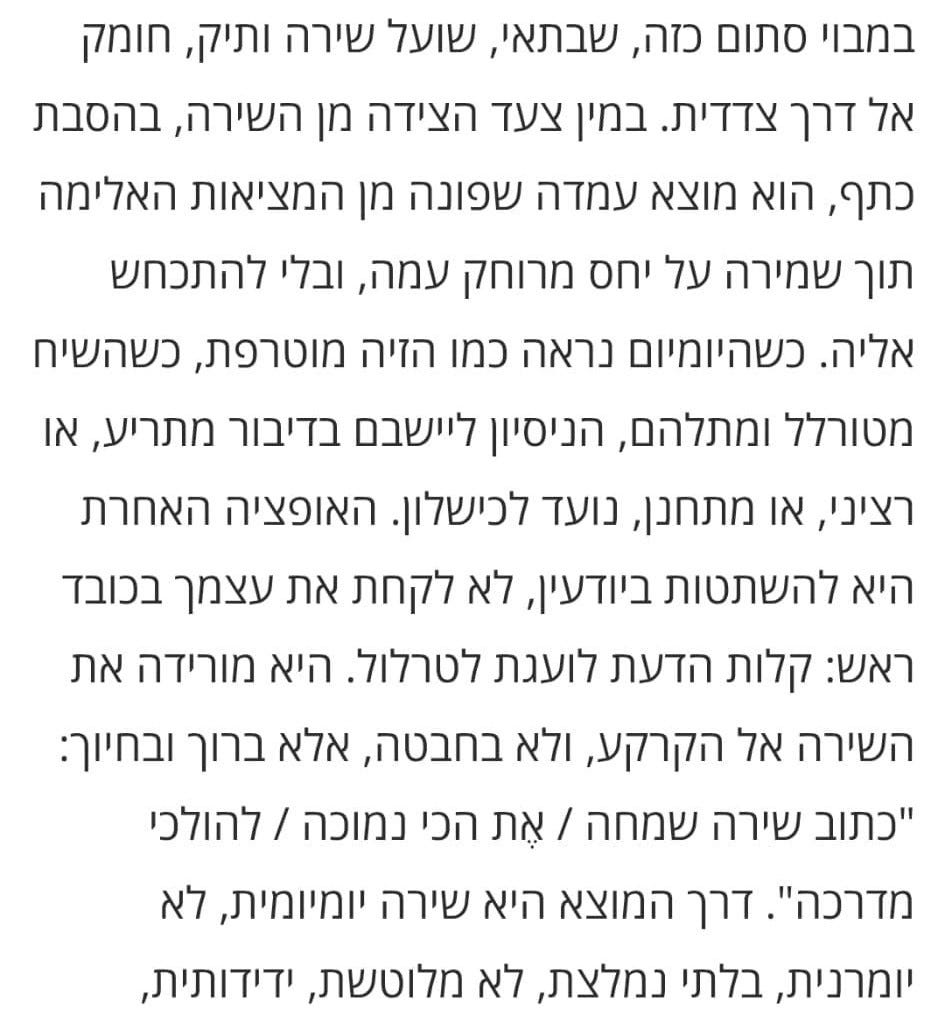 הזדהיתי עם הדברים. גם אני כמשורר המום ונבוך. כשלתי למצוא את המילים ואת נוסחן בתקופה השחורה הזו. עולות בי מחשבות כפירה על הטעם לכתוב בכלל שירים היום. ולמי. נוהגים להאשים את האיש ששמו מתחיל בב', אבל הרצח ההמוני הזה, הררי הגופות האלה של הילדים עם הכתפיים הרזות, הם כשלון הנזקף גם לחובת המשוררים והסופרים הישראלים, ולדבר הנקרא "הספרות העברית" - מה הטעם ב"שדה הספרותי" פה בעצם, ובי, אם אחר כך קוראי הספרות אצים-חשים להרוג ילדים, נשים וקשישים?